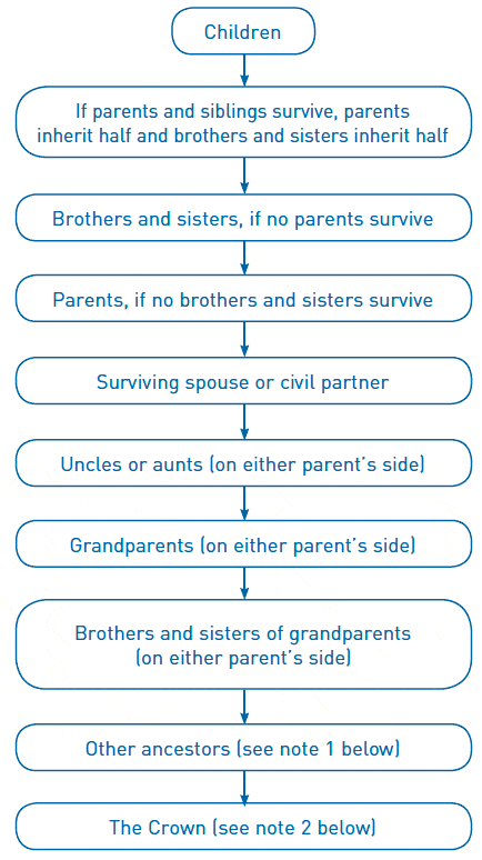 If a person is left alive within one group, then no other group further down the chart will inherit from the estate. Additionally, it may be any surviving children of a predeceased beneficiary can claim their parent’s share of the estate.